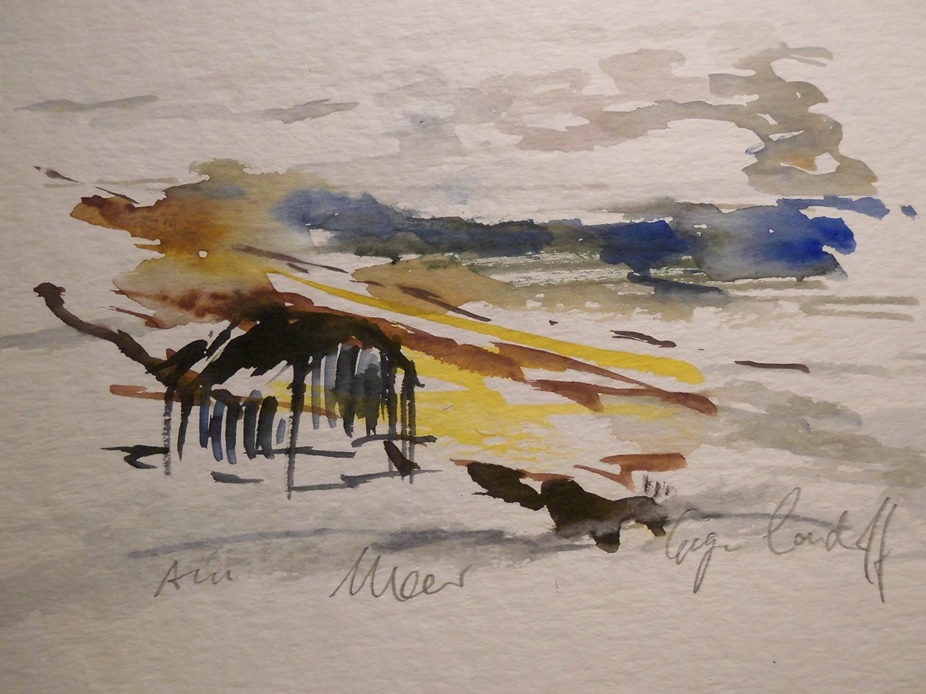 Die Malerin lebt viel in Frankreich direkt am Meer. Frankreich, die zweite Heimat der Künstlerin, hat mit seinen unterschiedlichen, sanften und schroffen Landschaften auch die neuen Aquarelle in der Ausstellung inspiriert. Meereslandschaften sind vertreten, aber auch das Medoc, das Perigord und die Auvergne.